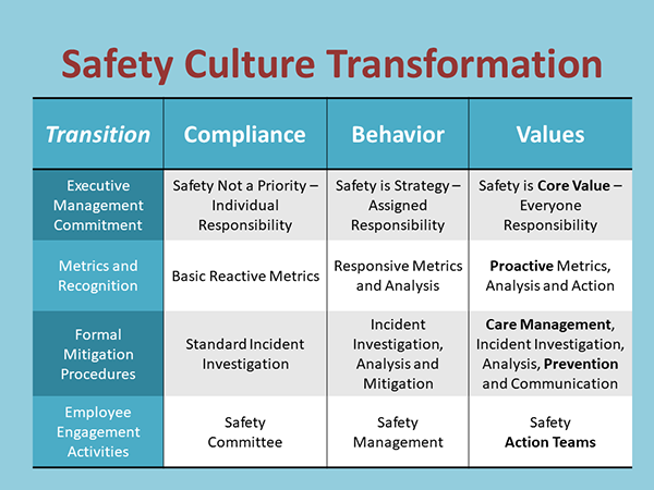To change to a positive workplace safety culture, a Values-driven organization must admit that many unsafe incidents are caused by a combination of factors in addition to human behavior errors. This organization accepts responsibility for every incident and strives to identify and mitigate every factor that contributed to the incident, so that no employee is ever injured in the same way ever again anywhere in the organization. Often, lessons learned from an incident stay in the facility where the incident occurred. Injury prevention should be shared through every level and operating division of a company. In addition, employees should be empowered to tell management about opportunities for safety improvement without fear of retribution. Management should be empowered to address those safety opportunities both financially and procedurally.